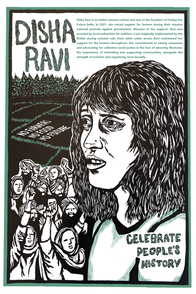 Disha Ravi is an Indian climate activist and one of the founders of Fridays For Future India. In 2021, she voiced support for farmers during their massive national protests against privatization. Because of her support, Ravi was arrested by local authorities for sedition, a law originally implemented by the British during colonial rule. Even while under arrest, Ravi maintained her support for the farmers throughout. Her commitment to raising awareness and advocating for collective social justice in the face of adversity illustrates the importance of defending and supporting communities, alongside the strength of activism and organizing more broadly.